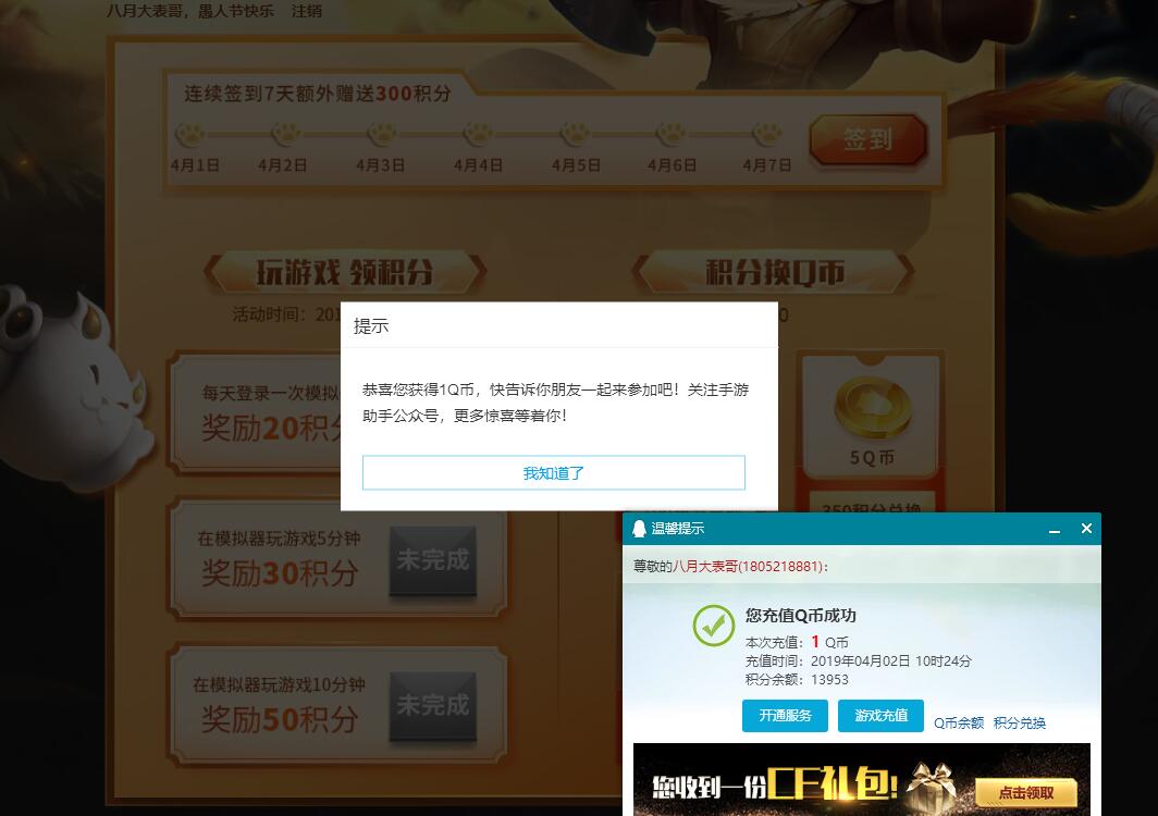 腾讯手游助手每天撸1Q币,完成左边的任务得100积分
