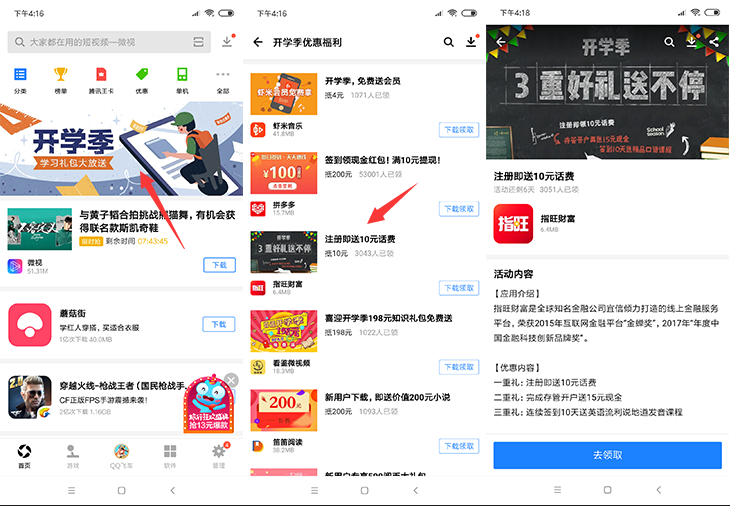 1、打开应用宝app,点首页幻灯片“开学季”,看到指望财富