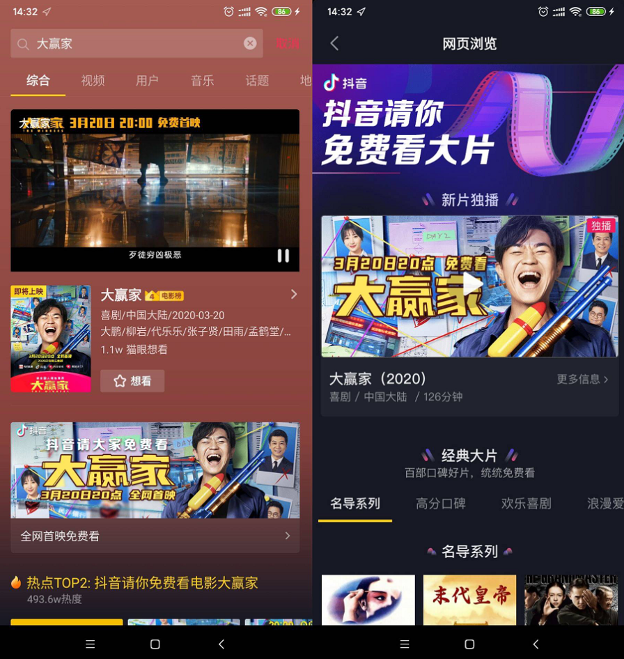 抖音APP、西瓜视频APP和鲜时光TV搜索观看。