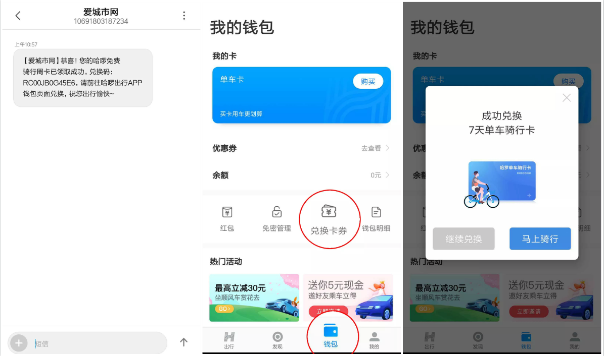登录爱城市网激活骑行卡,复制兑换码,再去兑换即可