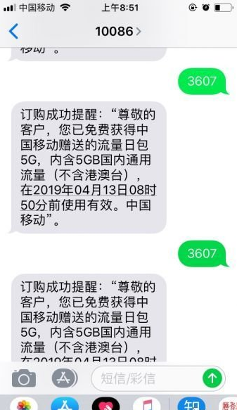 编辑短信3607发送至10086免费领取5G国内流量日包