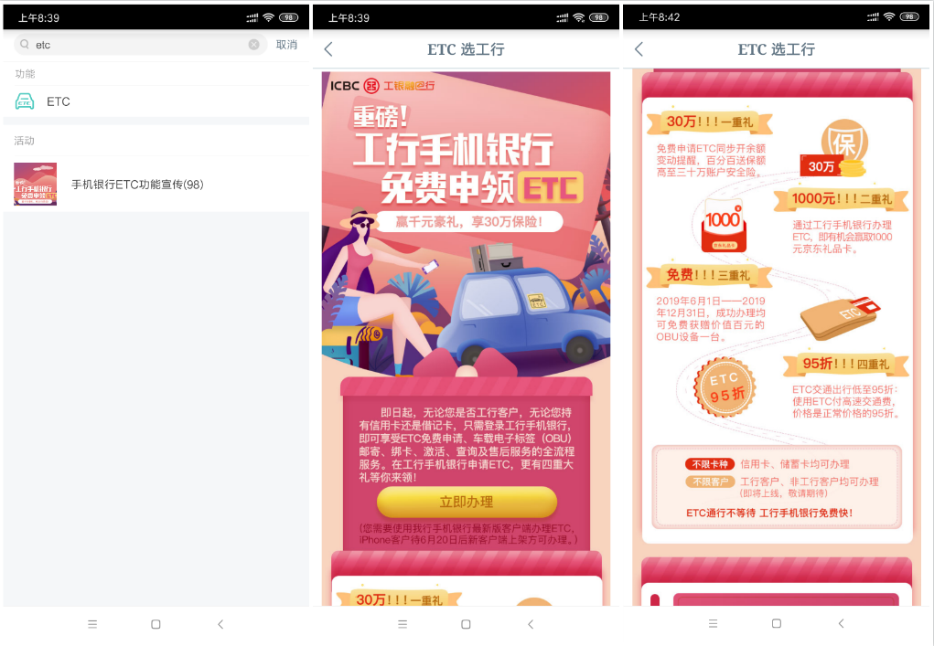 首页搜索“etc”提交免费办理活动页面写的是非工行卡