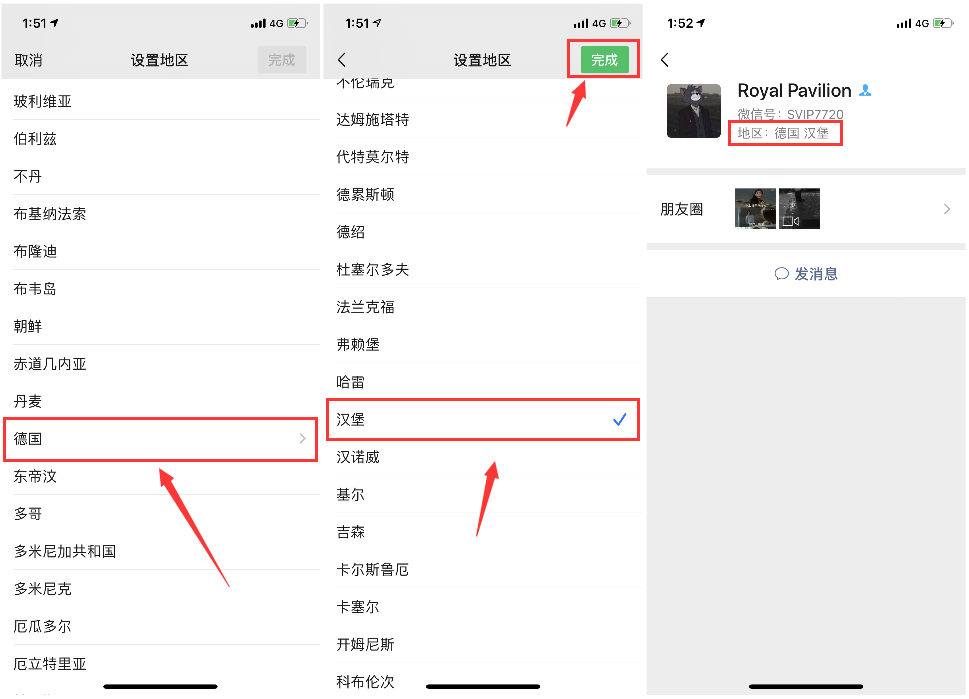 打开微信资料->更多->地区->点击德国地区->选择汉堡->保存即可
