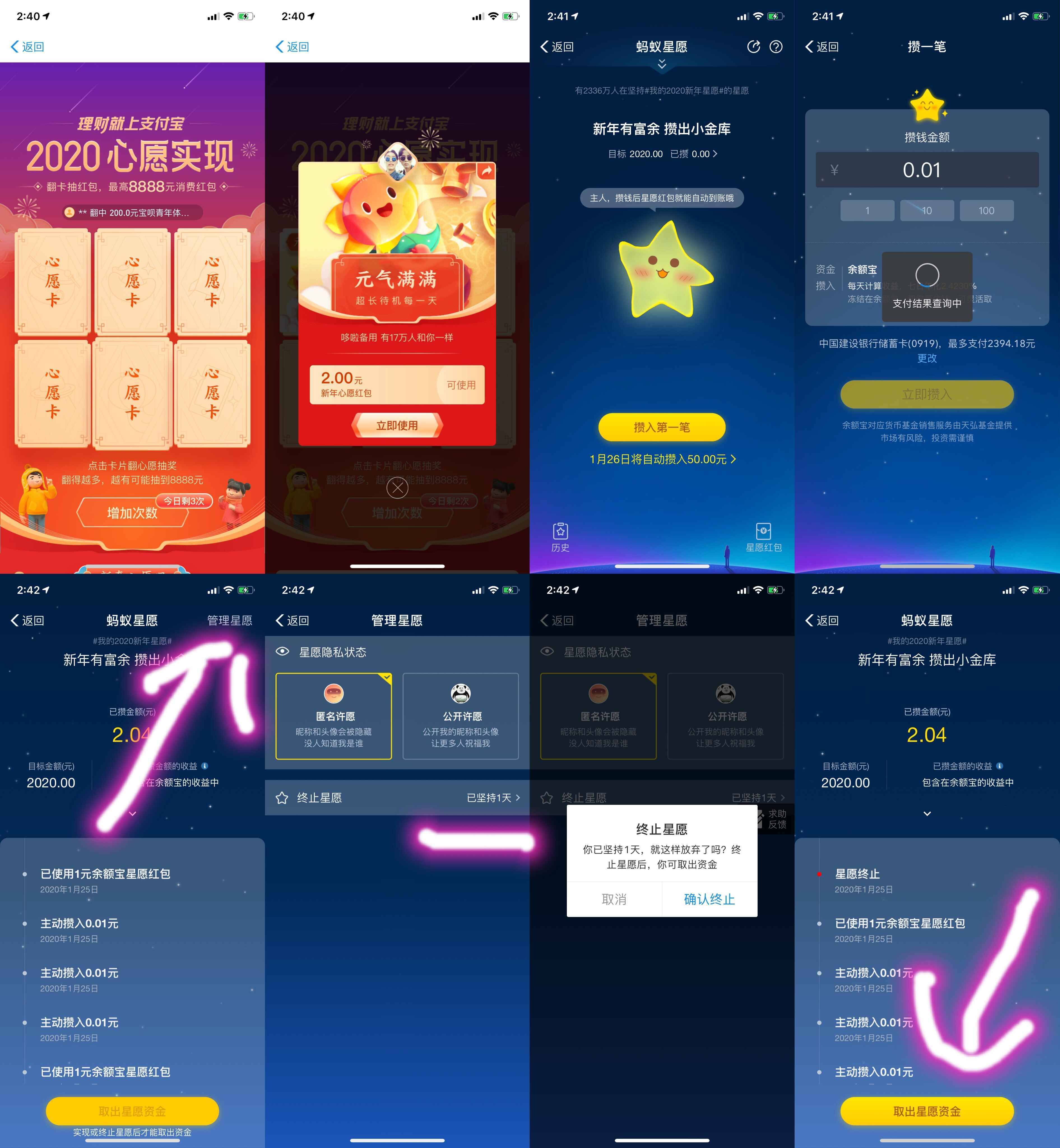2.使用2元心愿红包->开通心愿->攒入第一笔->攒入0.01元->反复转4次