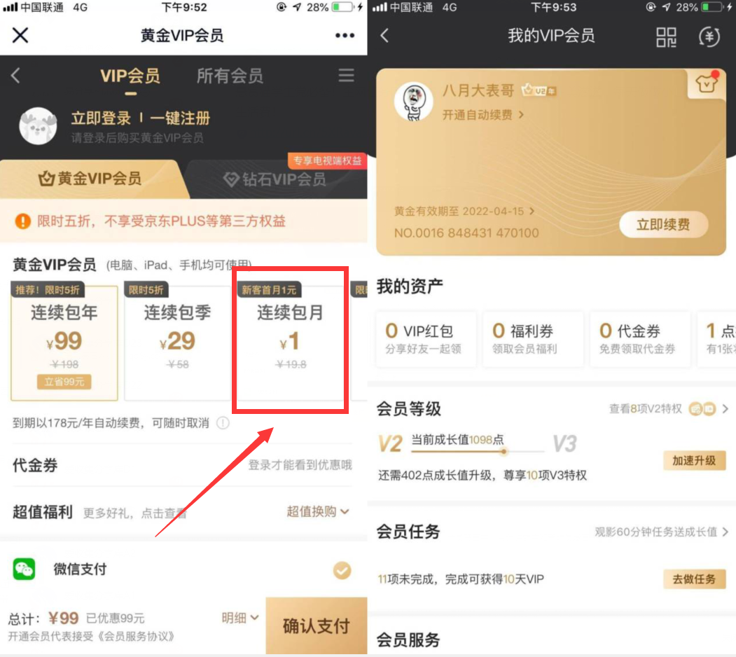 限时半价开会员:99元年卡、29元季卡、8元月卡!