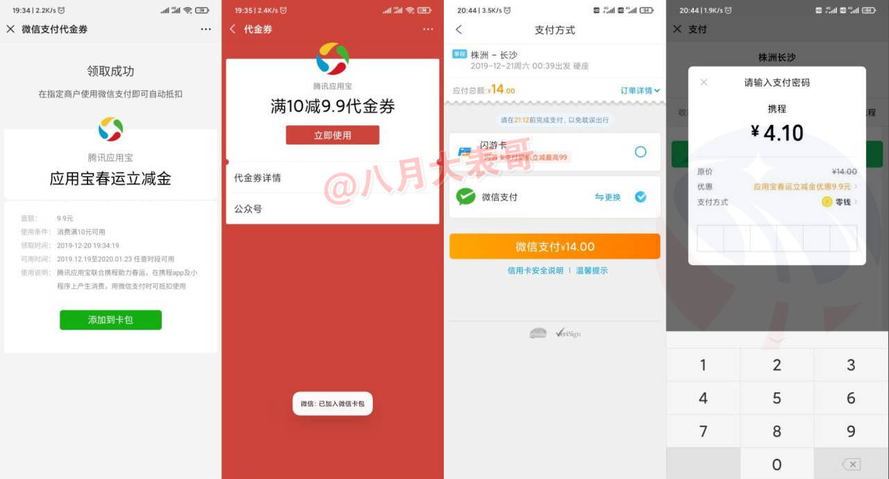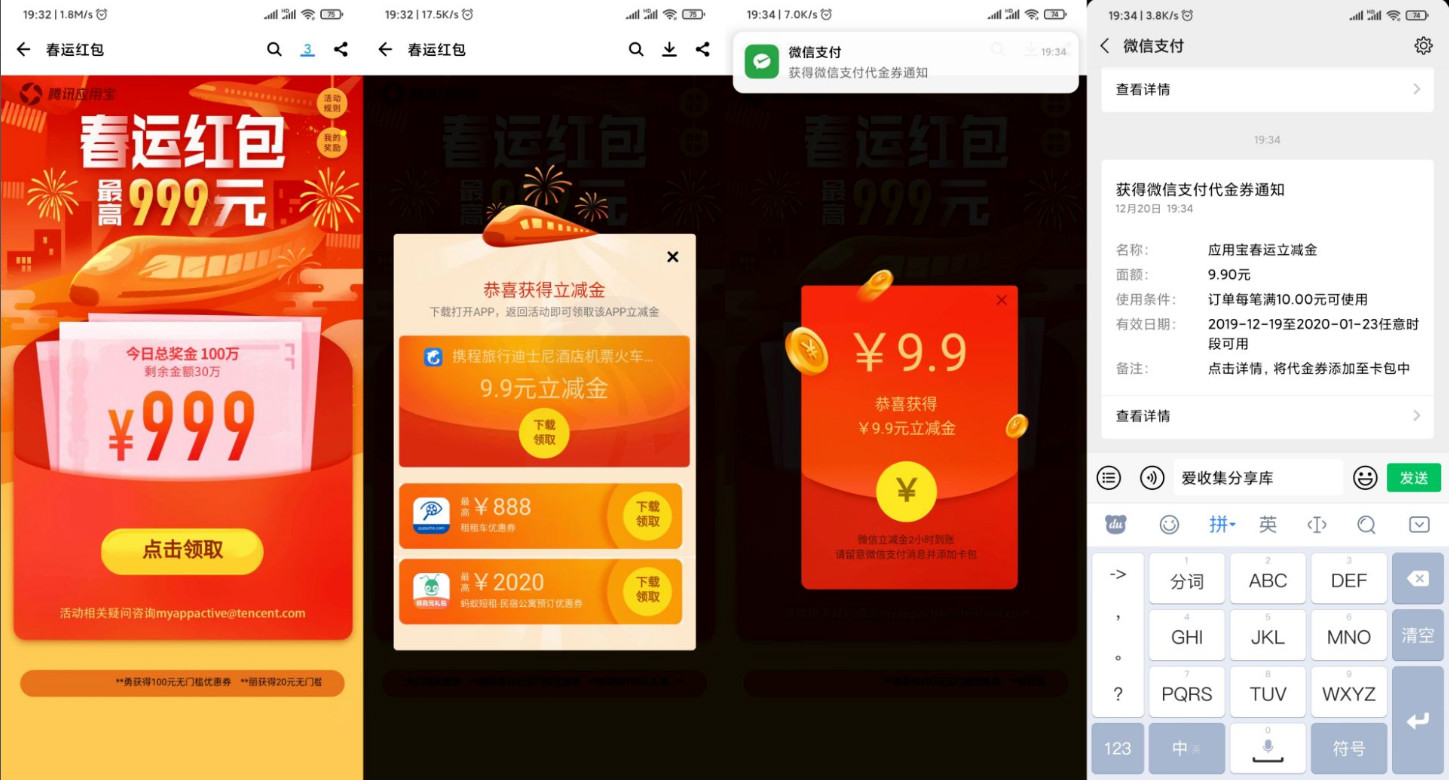 活动步骤: 1、下载应用宝打开:https://url.cn/51YfgNr 跳转APP领取->提示立减金有用->优惠券都没用! 2、出现立减金->下载领取->微信登录下载的APP 返回应用宝领立减金微信提示获得代金券通知添加到卡包 3、在APP必须选微信支付->限时有优惠就支付-没有就别付 PS:APP微信支付没有出现优惠就去小程序