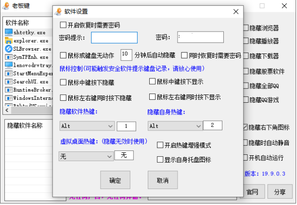 老板键能让你在上班时间玩游戏,看电影,淘宝购物,当老板突然出现时,不必手忙脚乱, 你只要按预先设置好的热键,就能快速将游戏界面,淘宝网页瞬间隐藏,再也不用担心老板的处罚了。 老板键无任何插件,纯净绿色,仅1个文件,无需任何驱动或者文件注入操作 就能完美隐藏全部微软的32位和64位系统的任何窗口和托盘图标。 功能说明: