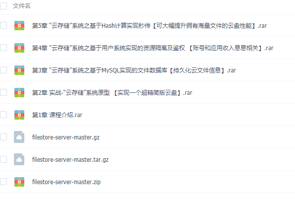 第1章 课程介绍 第2章 实战-“云存储”系统原型 【实现一个超精简版云盘】 第3章 “云存储”基于MySQL实现的文件数据库【持久化云文件信息】 第4章 “云存储”用户系统实现的资源隔离及鉴权 【账号和应用收入息息相关】