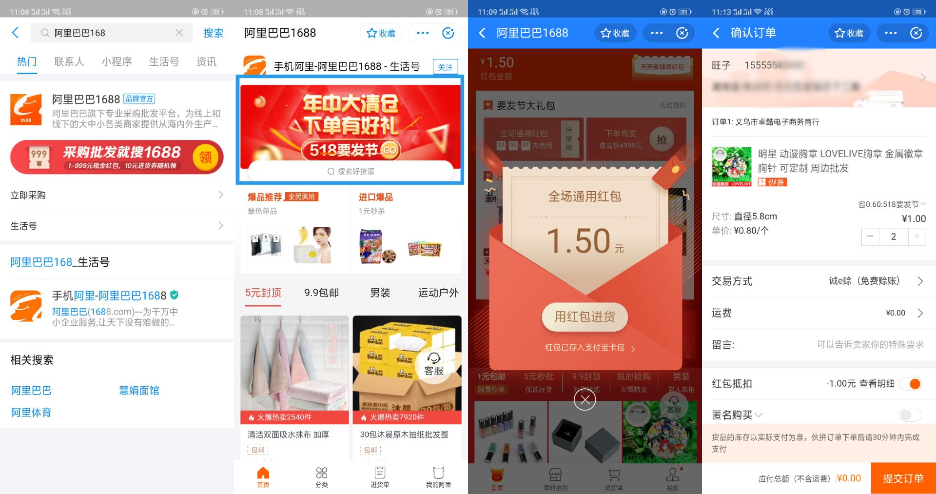 1.支付宝首页搜索 阿里巴巴1688 进去点“年中大清仓”会弹窗开红包