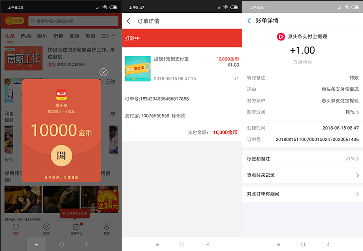 打开APP弹窗提示10000金币-领取跟着指引-提现绑定手机号秒到1元。