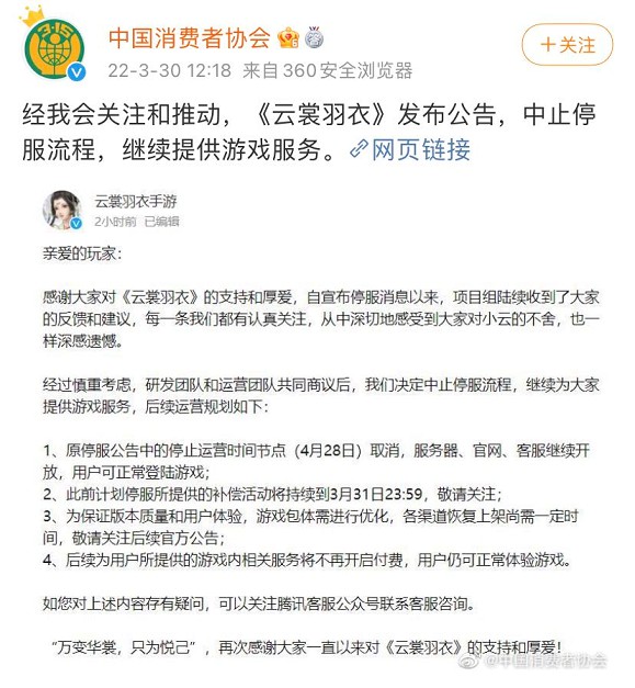 今年2月份我们刚发文章称“腾讯游戏代理发行的 3D古风换装手游《云裳羽衣》宣布停服” 在2月24日官方公布了 停服的补偿活动,并将于4月28日正式停止运营 该停运消息发出后,引起了大量的游戏玩家不满, 因为该游戏在停运公告的前一个月还推出了“妙笔霓裳卷”返场活动 经过了大量玩家一个月的辛苦维权,这件事也出现了反转 近日, “云裳羽衣手游”官微突然又发布公告宣布:“经过慎重考虑, 研发团队和运营团队共同商议后,决定中止停服流程,继续为大家提供游戏服务。 看到这条消息的时候小编都笑了 说实话,腾讯这几年停服了好几款游戏了, 不过中止停服,小编倒是第一次见 但是“中止”和“终止” 还是有本质区别的, 希望官方只是打错了字,而不是玩文字游戏 |