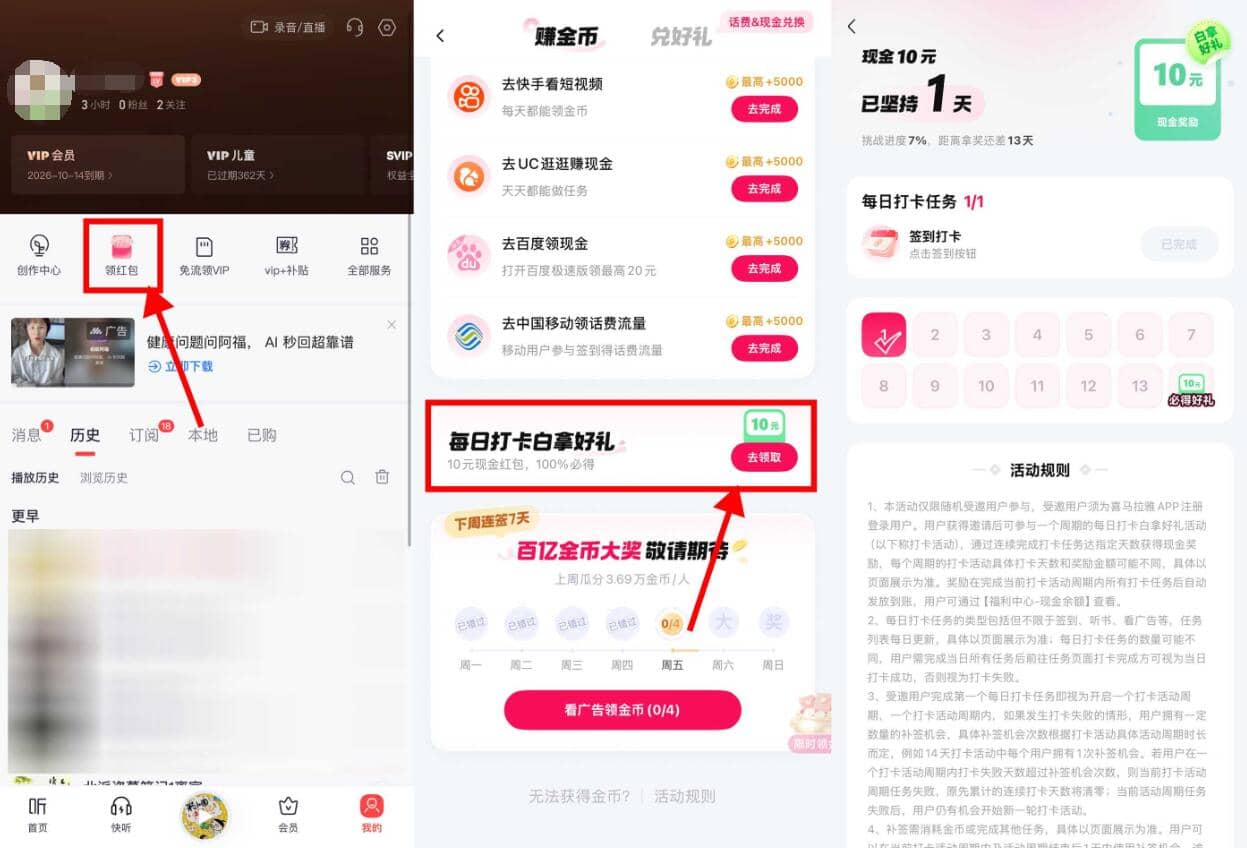 喜马拉雅APP底部“我的”->点“领红包”进入->下