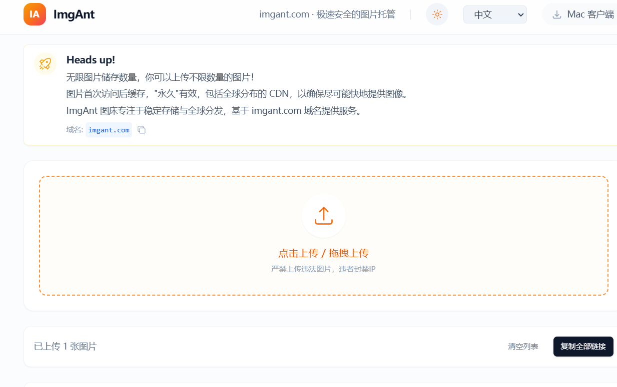 今天分享的 imgant.com 完美解决这些痛点,它是一款主打免登录、高稳定的在线图床,