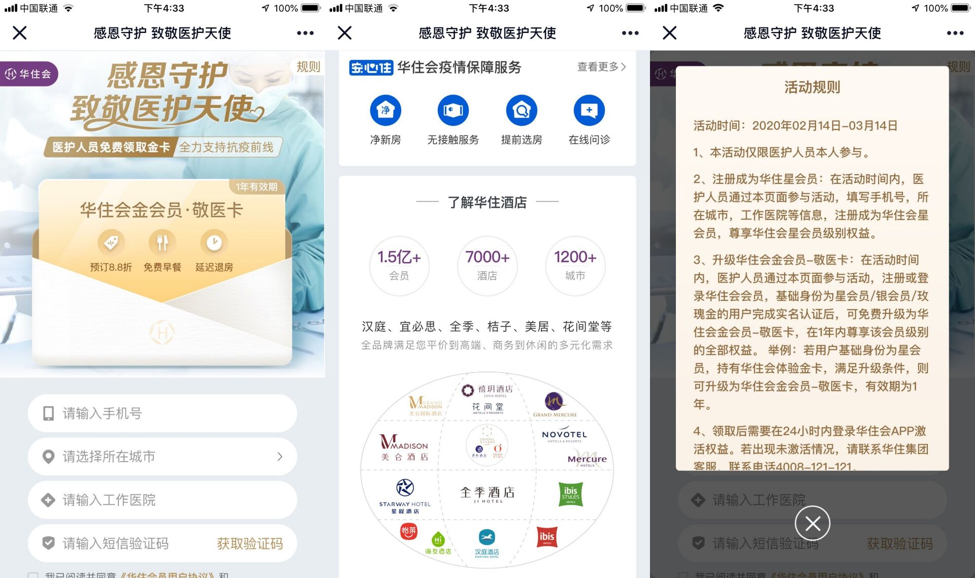 本活动仅限医护人员可领 打开地址领取后->先是星会员->通过认证后提升为金会员 旗下有很多家知名酒店,比如汉庭。 作用:预定酒店8.8折+免费早餐+延迟退房 不符合的可以分享给身边的医护工作者朋友 活动地址:https://campaign.huazhu.com/static/2020/best-medical-workers/#/ |