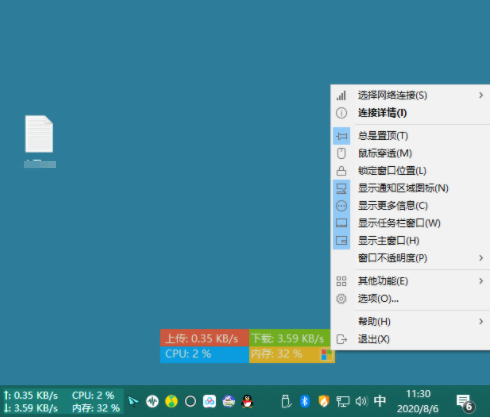显示支持更换皮肤和自定义皮肤历史流量统计 使用说明: 程序启动后在窗口点击鼠标右键可以弹出右键菜单,主要功能都集中在这个菜单中。 如果需要让它嵌入到任务栏显示,请勾选“显示任务栏窗口”。 要显示CPU和内存利用率,请勾选“显示更多信息”。 下载地址:https://pan.baidu.com/s/1hlErbEXFiFILiU4XptwusA 提取码:asj6 |