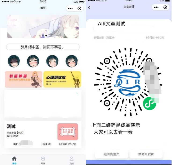 及数据库所以使用该程序需要重新安装emlog和数据库 安装教程: 1、配置ssl宝塔可免费申请 2、安装后端上传源码-导入数据库-修改config.php中的数据库库名、账号、密码 3、修改前端链接路径:utils/api.js中的博客链接 修改文章底部关注公众号路径:pages/blog-info/blog-info.wxml 4、内部图片、广告ID等需要自行修改 注意事项: 1、PHP版本:5.6 2、后台账号:admin 3、后台密码:123456 4、分类图片在后台分类管理中修改 5、后台小程序管理暂时不加入,需要可以定制 6、小程序首页图片、分类等暂不使用后台修改