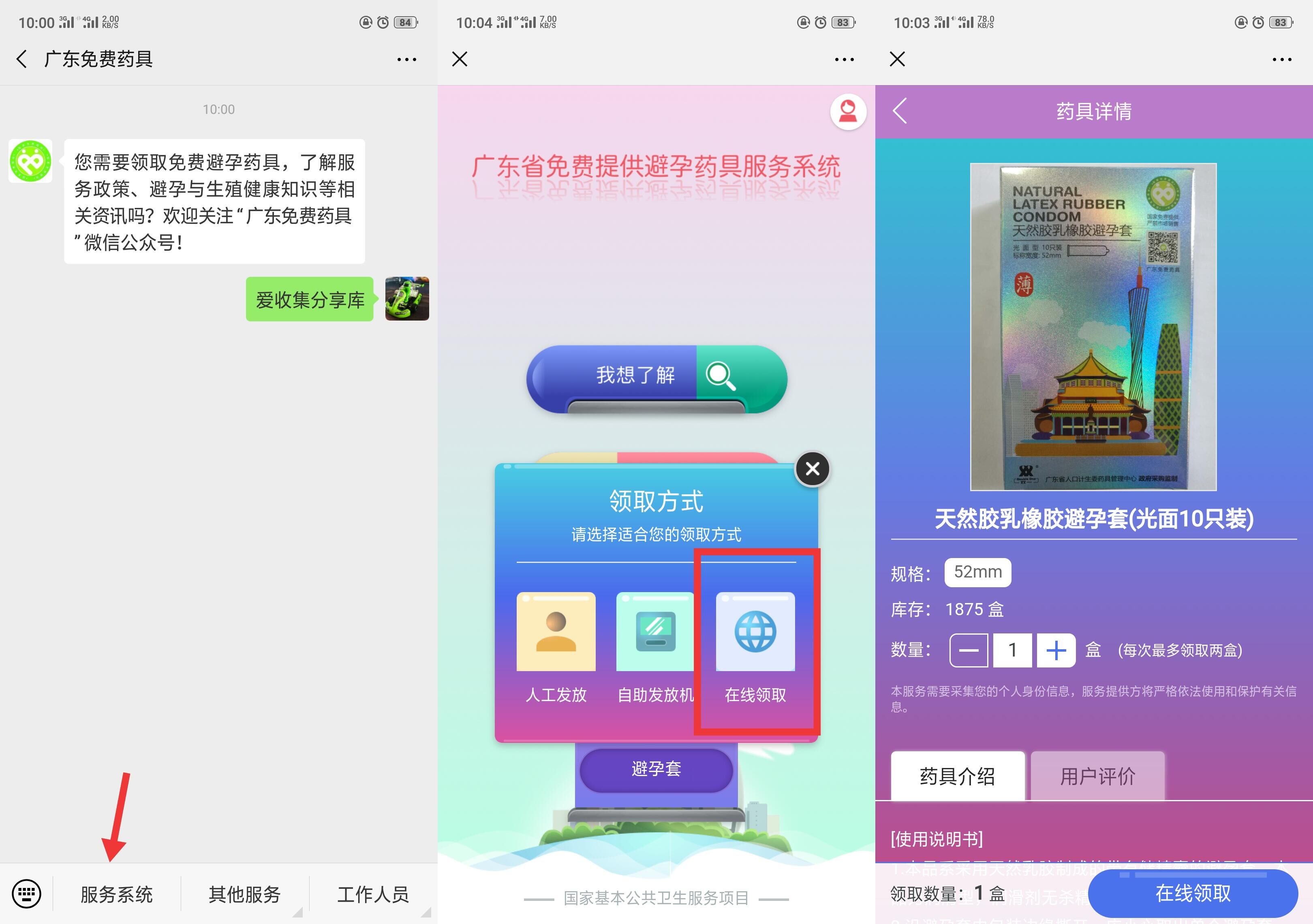 菜单栏“服务系统”->领1盒避孕套->限广东用户~