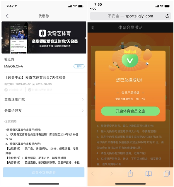 打开掌上生活APP - 首页下拉 - 掌上推荐 - 领券中心 - 找到“爱奇艺体育会员7天体验” 然后领取以后查看兑换码复制去兑换即可,正需要的上~ 兑换地址:http://sports.iqiyi.com/resource/h5/activation-code.html |