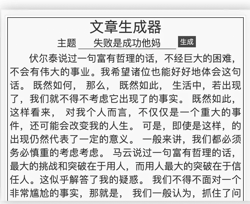 最后反而连一个普通学生的水平都不如,非常尴尬! 其实,在这个数字时代,想要创作一篇符合要求的文章并不难,写文章并不一定非得需要人来完成, 有的时候,也许智能机器人比人更富有“文采”。就比如,前段时间曾红极一时的狗屁不通文章生成器,就能智能生成文章。 狗屁不通文章生成器:https://suulnnka.github.io/BullshitGenerator/ 狗屁不通文章生成器只需要输入主题,就能生成一篇看似文采十足,语句顺畅,却又道理全无, 狗屁不通的文章。文章生成器非常适合用来敷衍了事以及创作凑字数,