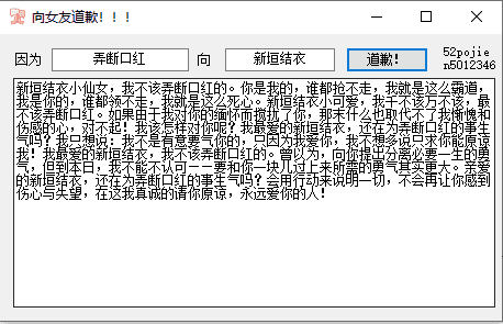 有了这款工具,不仅孩子写作文轻松了许多,大人在合适时机也能用得上。 女友道歉生成器: 吾爱破解论坛从来都是人才辈出的场所,很多国内外知名原创软件都源自这里,这里不仅聚集着各色软件大佬, 还汇聚着数量颇多的行业软件,今天小高就给大家分享一款非常有特色的文章生成器:女友道歉生成器。
