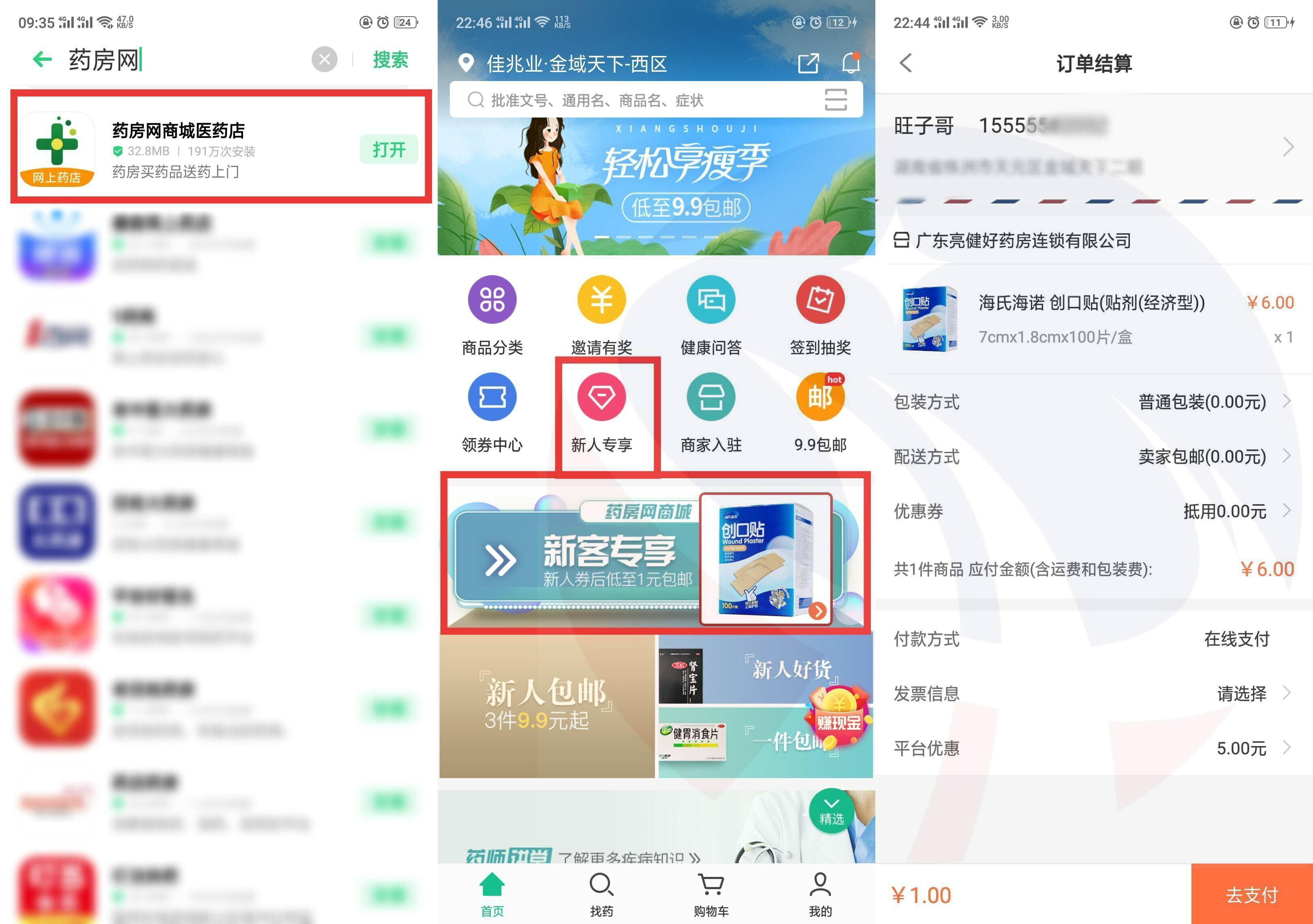 新用户注册如上图所示->新人专享1元创可贴->付款坐等到货即可!