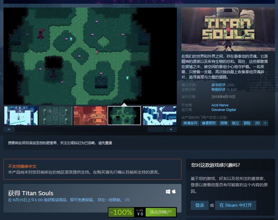 一款像素风格独立动作游戏,在游戏当中,玩家将探索自己祖先的远古废墟, 并发现超过20种巨大并独特的泰坦巨人,每一个都有独特的攻击方式和弱点。 玩家需要做的就是找到他们的弱点并将其击败来获得存在他们体内的远古神力。 领取地址:https://store.steampowered.com/app/297130/Titan_Souls/ 活动时间:2021.6.15 01:00结束 |