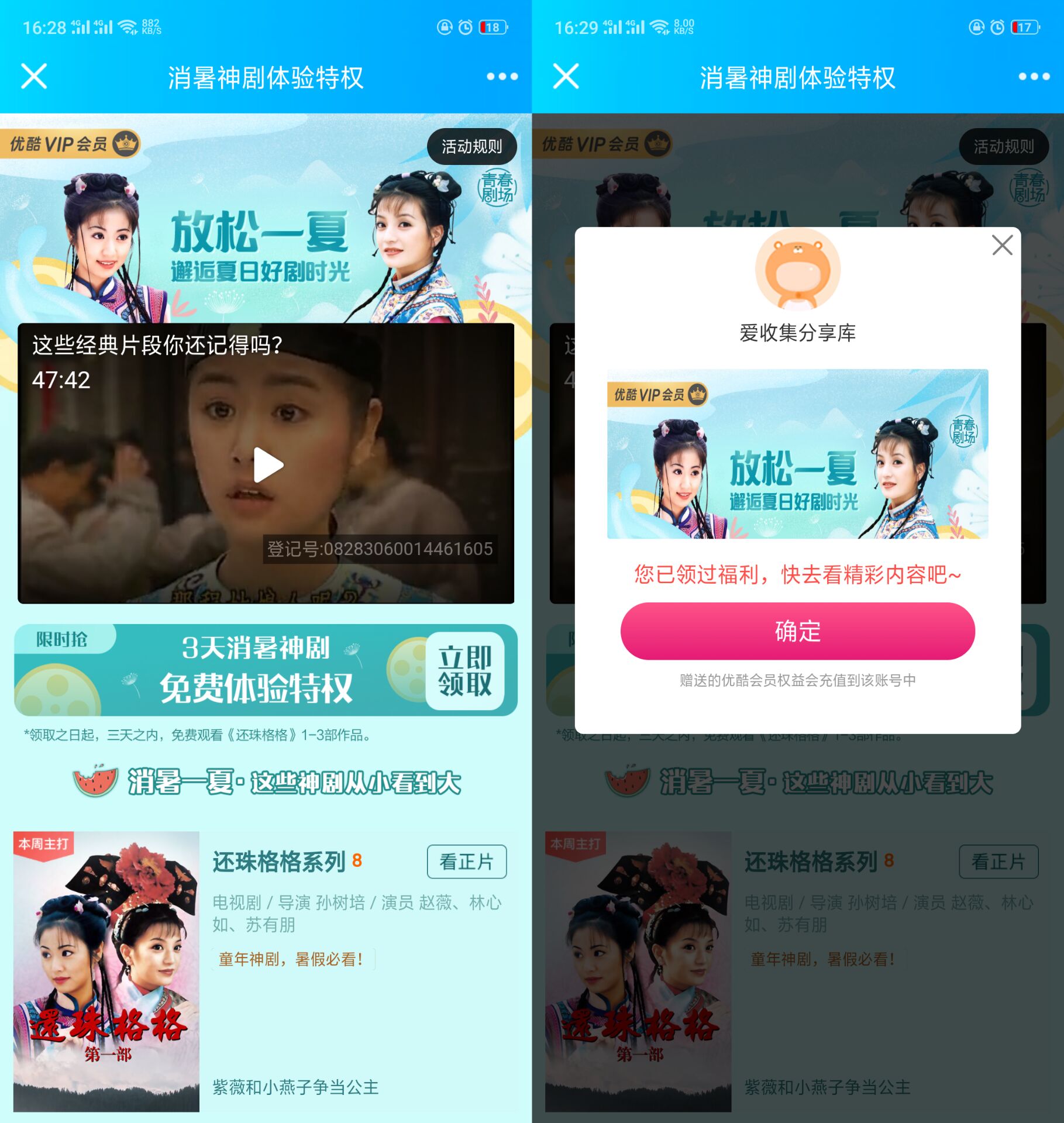 暑假可以领取3天免广告特权,以及免费观看还珠格格1-3部