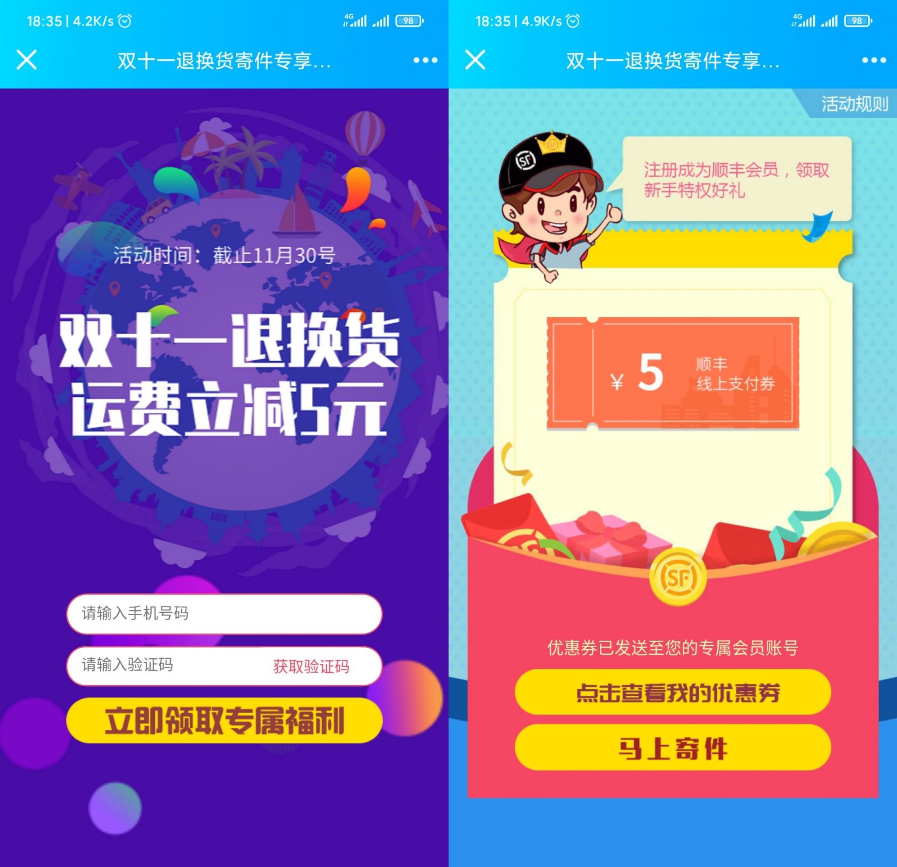 顺丰双11免费领取5元线上券,退换货时可抵扣使用!