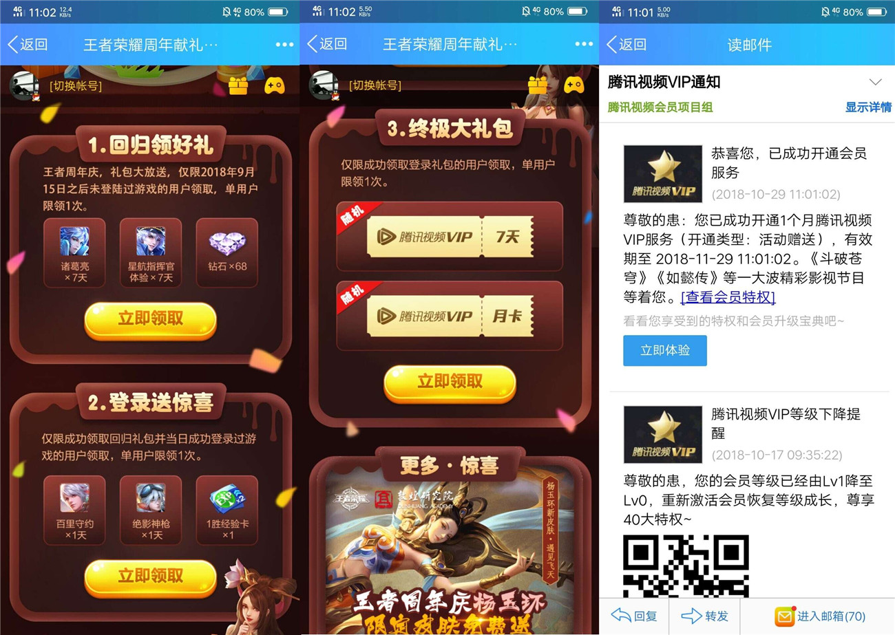 限9月15日之前没删过游戏的号,领取登录礼包后下拉领取7或30天腾讯视频VIP