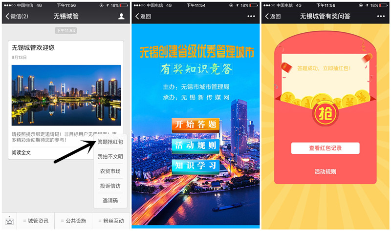 关注【无锡城管】公众号 点击菜单栏【粉丝互动】--【答题抢红包】进入答题页面