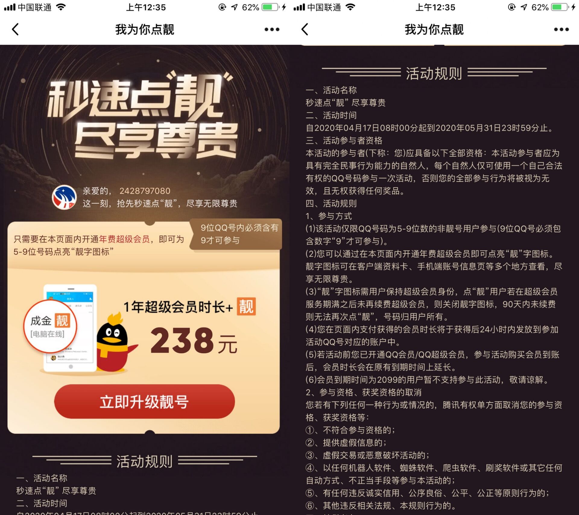 | 仅限5~9位数QQ才可以有资格 只需在本页面支付1年QQ超级会员,即可升级靓号图标 截止日期:2020.4.17~2020.5.31 活动地址:https://m.vip.qq.com/clubact/2019/lightliang/index2.html |