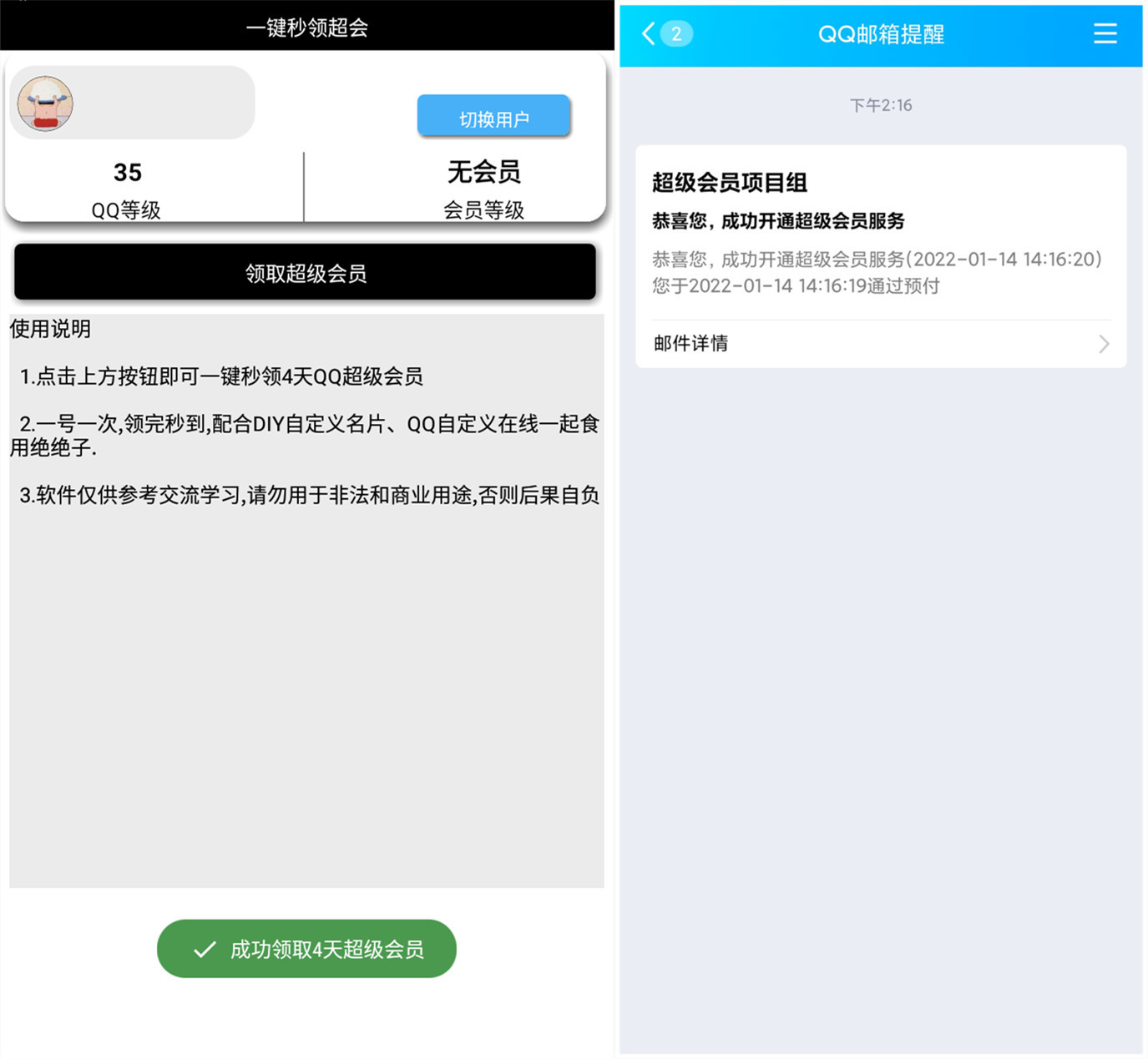 超会白嫖助手来了,一键秒领4天超会,一号一次, 领完秒到,配合DIY自定义名片、QQ自定义在线一起食用绝绝子。 下载地址:https://pan.baidu.com/s/1dg2KYjVd8UZb7EcPuYadvA 提取码:asj6 |