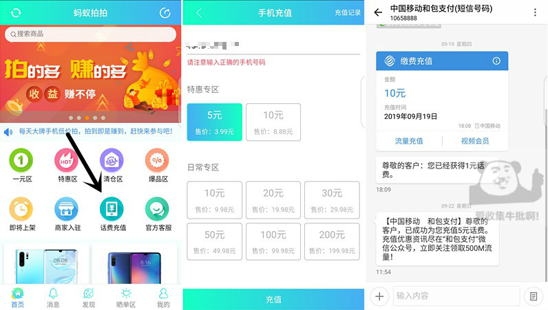 大家就在体验专区里面充值2个选项3.99元充5元话费