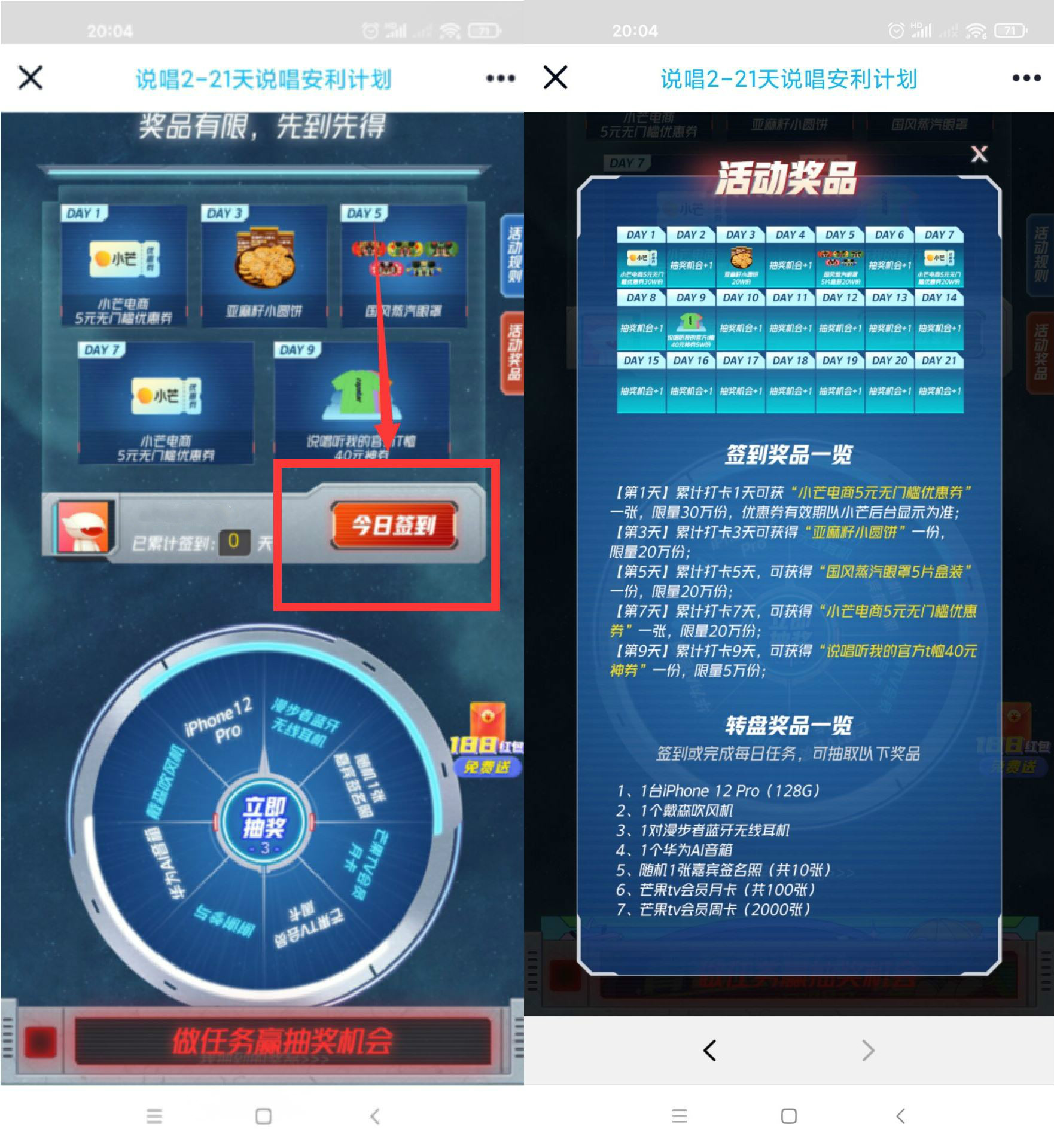 1、打开地址下拉页面签到->第一天的5元优惠券没用无视->签到3天可以 2、获得小饼干一包->签到5天可以获得蒸汽眼罩5片盒装->都是包邮的! 活动地址:https://h5.mgtv.com/2021/h5/60e6cca6d89ea784c26e24e3 活动时间:2021.7.18~8.7 |