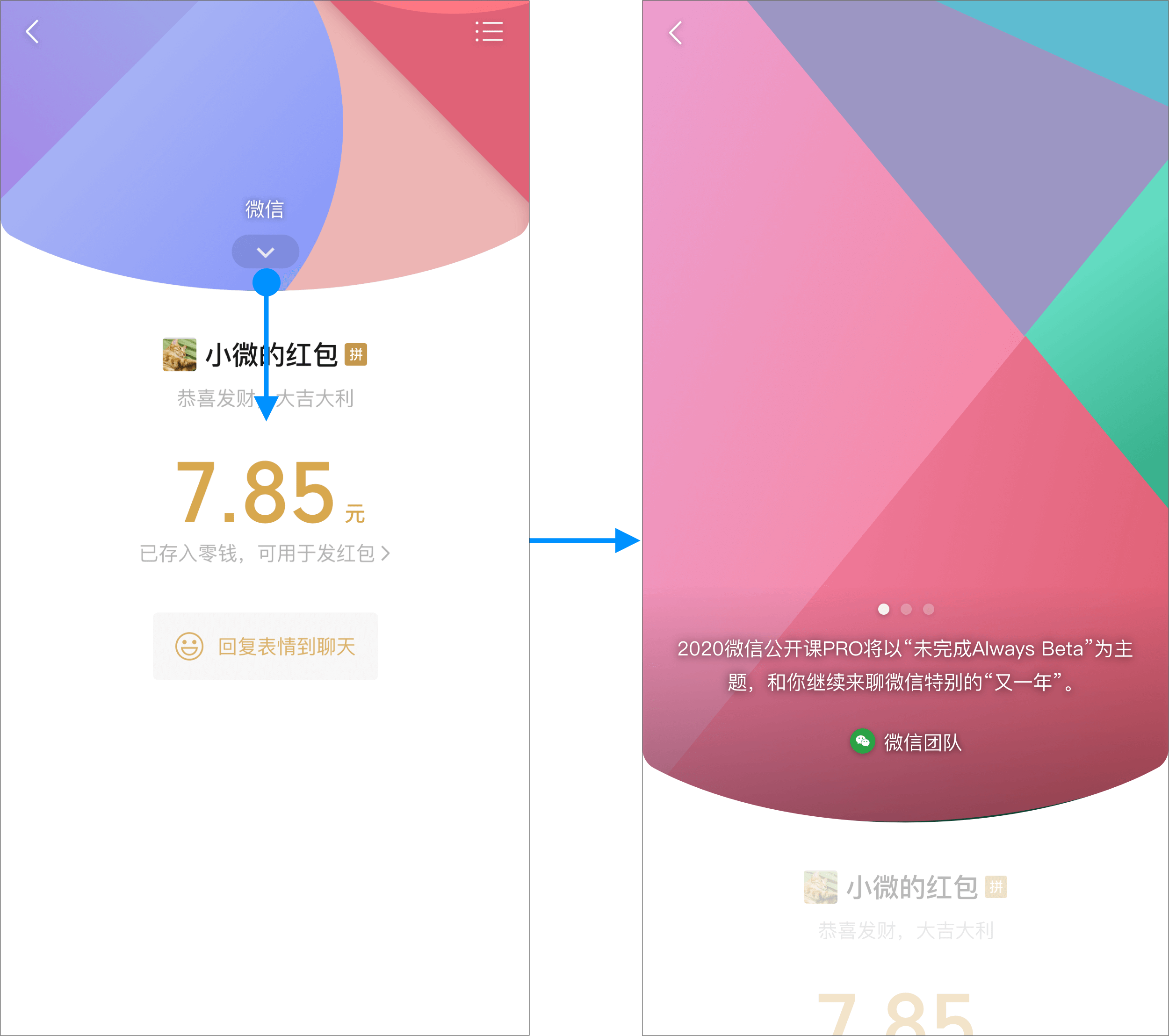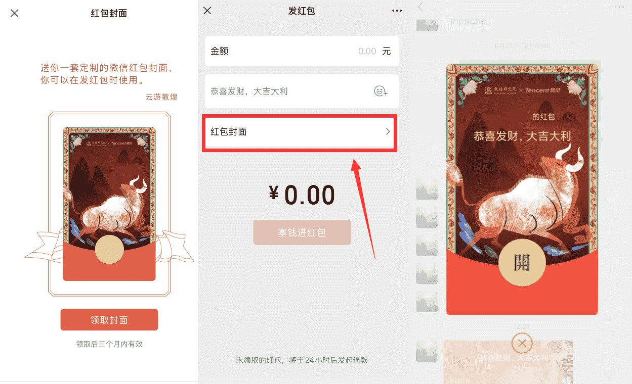 定制方只需上传一个封面图片,即可同时展示在发红包页、红包消息气泡、拆红包页、红包详情页中。