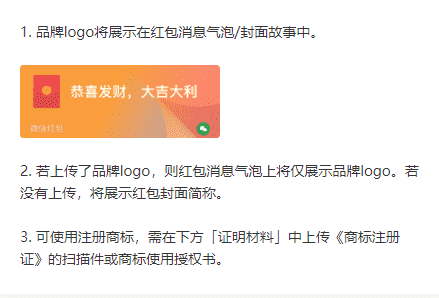 品牌logo将展示在红包消息气泡、封面故事中(如未上传品牌logo,将仅展示封面简称)。