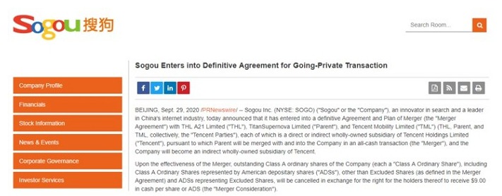 2020年9月29日晚上 搜狗发布了一篇公告