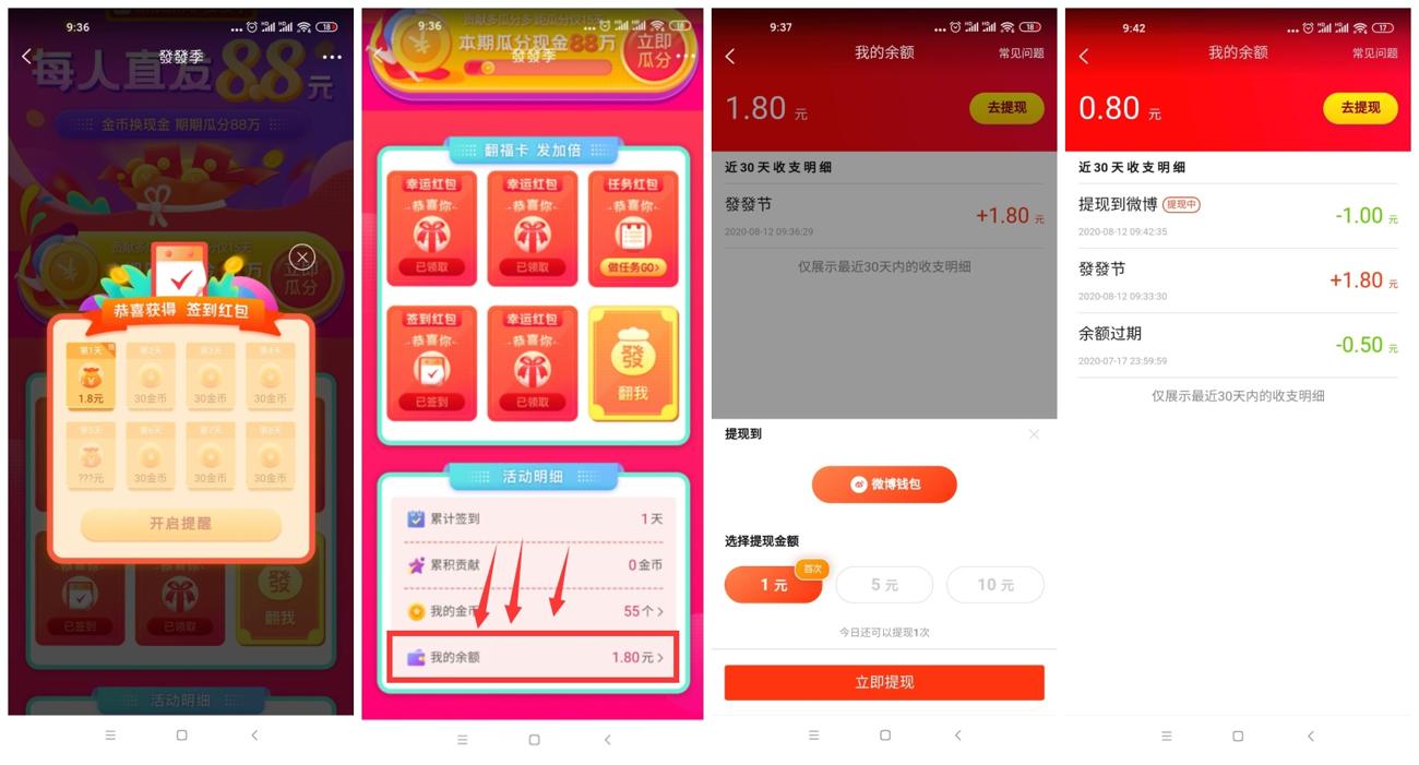 | 步骤如下: 1、下载登录新浪新闻APP->然后打开地址跳转到新浪新闻APP参加->点开5个红包 2、有一个会中1.8元->下拉页面我的余额提现,等到账了新浪微博钱包里, 然后在手动提现到支付宝里,另外规则说每天领6个红包,累计10天保底8.8元现金 活动地址:https://sinanews.sina.cn/activities/double_fortune.html 活动时间:2020.8.28结束 |