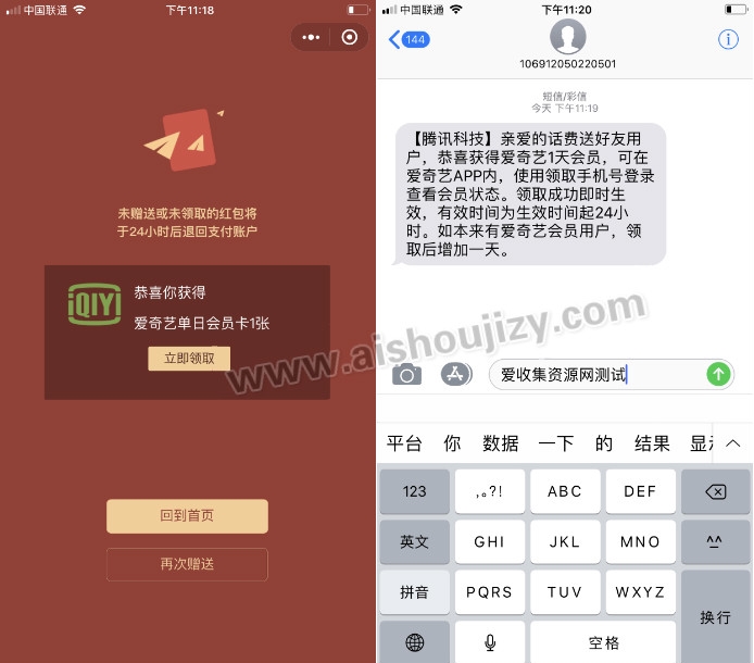 发送到聊天界面,点进去然后领1天爱奇艺会员->秒到账