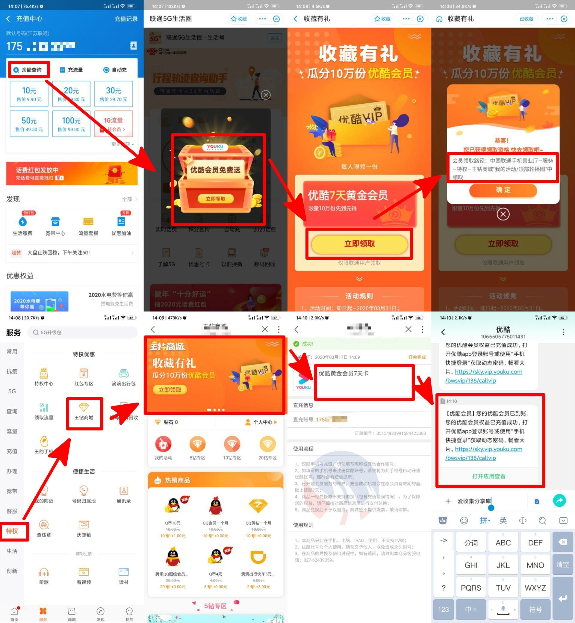 支付宝扫码领取->然后打开联通APP->服务->特权