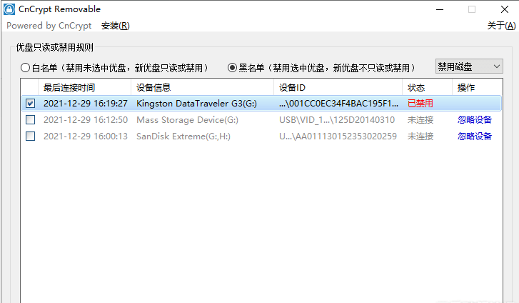 防止自己的电脑被图谋不轨的小人给用U盘拷走文件 基于”CnCrypt 主机防御“开发的一个款优盘禁用,写保护工具, 支持对单个优盘的禁用和写保护,功能不作描述,图片表达一切,需要拿走。 下载地址:https://pan.baidu.com/s/1fy3e_W6TOtQS5oiy5tJqYQ 提取码:asj6 下载地址本地下载 |