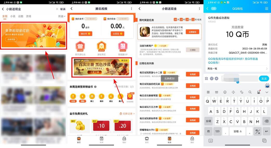 1、腾讯视频APP->搜索“小鹅送现金”->点击横幅进入->立即前往下载游戏