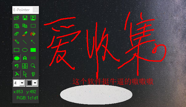 E-Pointer又名《红烛电子教鞭》,可以说它是一款电脑黑板软件,运行这款电脑 黑板软件后您可以随便在电脑屏幕上写字和画画,可用于教学演示,产品展示等,