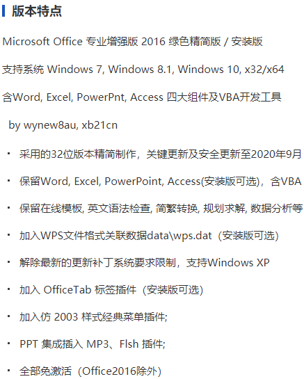 微软办公软件套件Microsoft Office 2016 正式版于2015年9月22号正式推出, 其特点是为多人跨平台办公与团队协作打造。Office2016相比Office2013的变化不是太大, 2016版本可个性化主题颜色,提供模板下载、Word引入实时协作, 全新的Excel数据制图,Excel可直接识别手写方程式等等,大大提高办公效率!