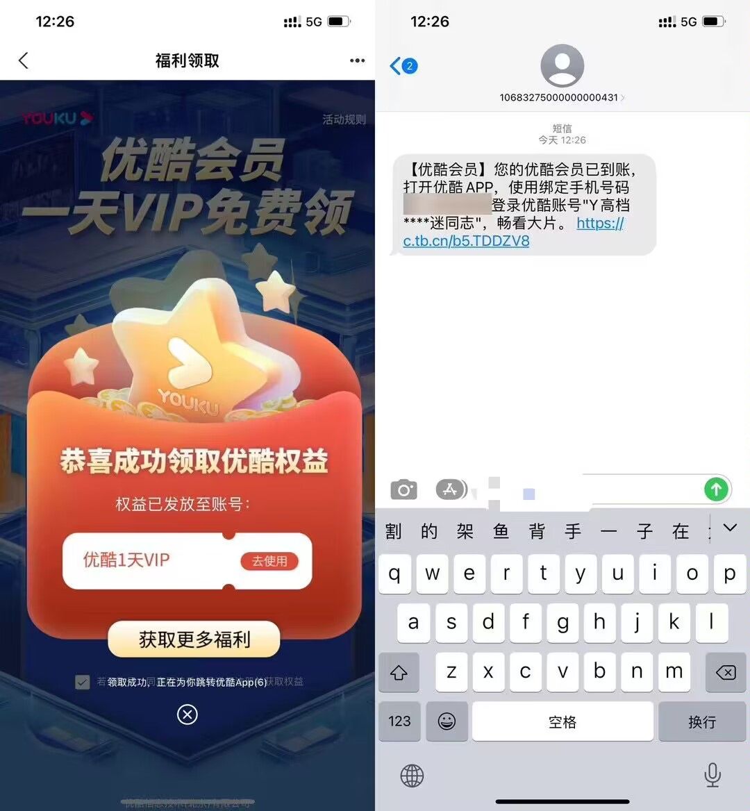 支付宝APP扫码->输入手机号直接领->刚好要看优酷的可以上!