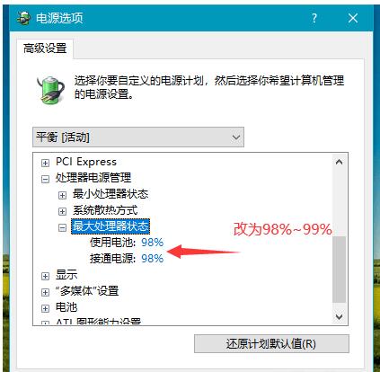 第四步,将处理器的最大状态改为98~99%,即损失1~2%的性能。