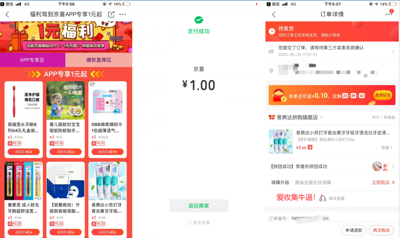 步骤如下: 1、复制链接到微信打开领1元->跟着提示下载京喜APP跳转完成1元首单 商品选个自己刚需的入团支付1元(我撸的牙膏)然后返回微信活动页面 2、等待提现页面出现“去提现”按钮提现1元秒到 (实测下单后要等几分钟才能提现) 活动时间:2020.5.21~6.30