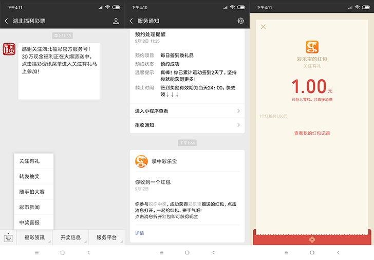 1、微信扫码→福彩资讯→关注有礼→免费领红包→高几率中微信红包