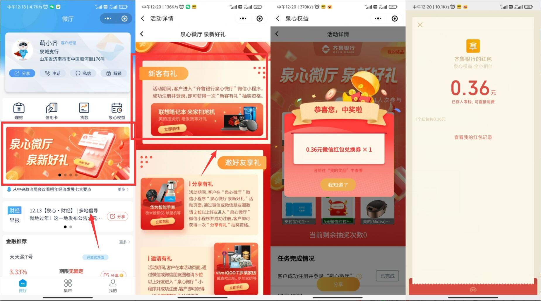置顶新一期:依次参加,部分必中 活动一 微信关注“民生银行苏州分行”->发送“年终红包”->点推文进去抽红包 活动二 1、微信关注“东亚前海证券官方服务号”->发送“红包” 2、点推文进去->再点右下角->一岁一礼->人人有礼领包 活动三 1、微信小程序搜索“齐鲁银行泉心微厅”->进去后点首页中间轮播图“泉心微厅 泉新好礼” 2、进去后下拉点新客有礼->立即前往->抽奖必中->中了后再点我的奖品->截图二维码兑换红包 活动四 微信关注“星妈会”->右下角->个人中心->中间轮播图“挑战大富翁”->进去玩游戏机会用完抽红包 活动五 ①https://tb3.cn/AfVBZr(点图进去0.18元) ②https://tb3.cn/AHvGik(点图进去抽奖) ③https://tb3.cn/AltSMs(打开后关注公众号点推文进去抽奖) 活动六 微信小程序搜索“三一机惠宝”点弹窗双12->邀个小号->大号返回抽奖 活动七 1、微信关注“腾讯自选股微信版”->福利中心->提示无资格也可以参加->无视那个提醒 2、直接点->周一抢牛日->按照指引分享得到金币无视->直接返回拆红包, 跳过->明天到账 活动八 微信打开下拉到底->阅读原文进入-> 下拉页面全部选择->提交抽随机红包 |