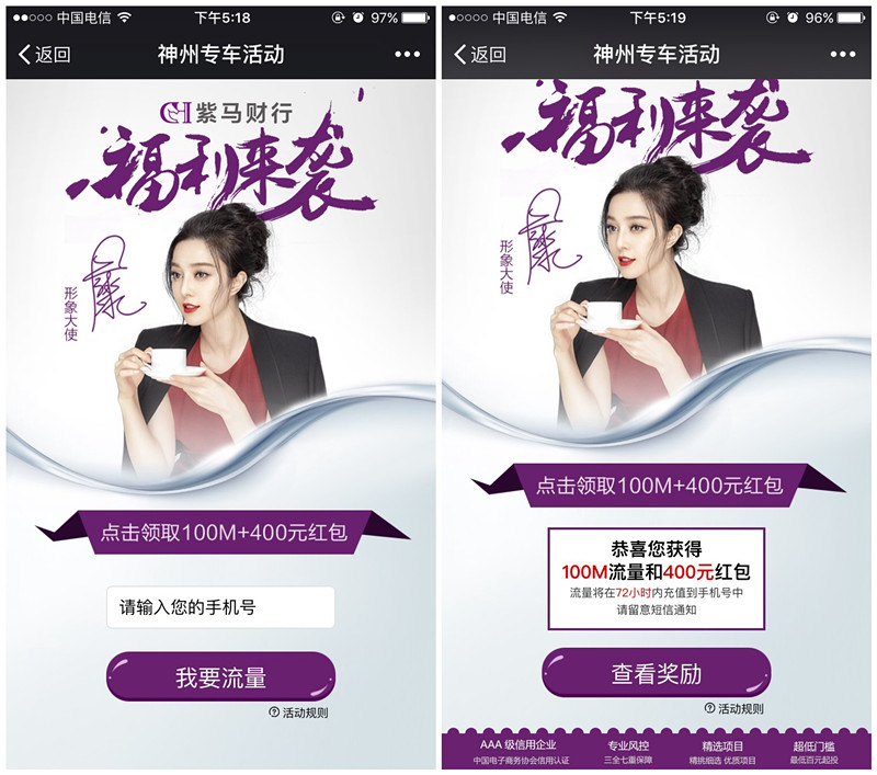 输入手机号码,完成验证即可100%获得100M手机上网流量和400元专车红包劵,流量是72小时到账